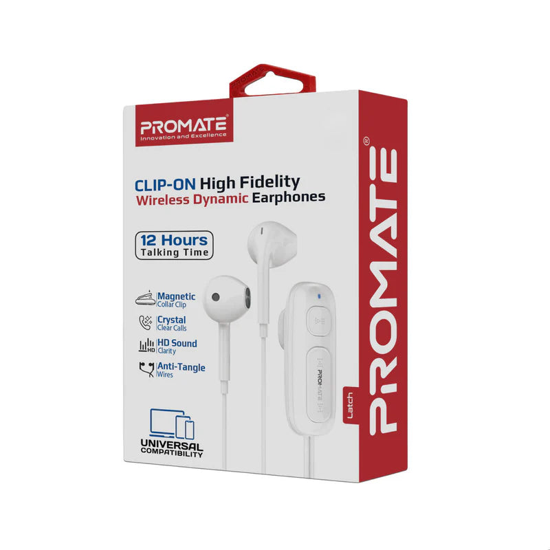 PROMATE Latch Clip-On High Fidelity - سماعة لاسلكي ديناميكي توضعحول الرقبة بلوتوث 90 مللي أمبير / أبيض
