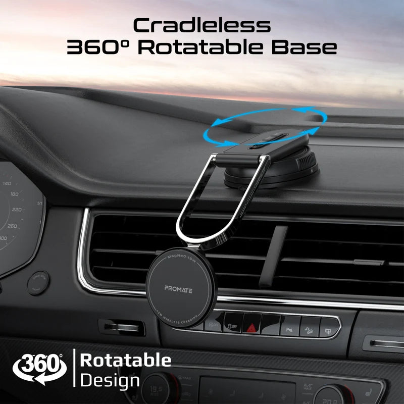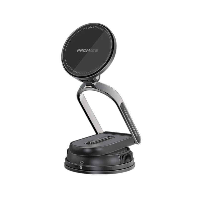 | الوصف | Revolutionize the way you charge on the go with Promate’s MagNeo-15W. This wireless phone charging mount combines sleek design and cutting-edge technology for a seamless experience. Delivering 15W MagSafe-compatible charging, it ensures your devices are always powered up with speed and efficiency. The adjustable extendable arm and detachable body with a secure lock mechanism, offer unmatched versatility, making it perfect for both Windshields and dashboards. Built with durable zinc alloy and a cradleless 360° rotatable base, it provides optimal viewing angles while keeping your device securely in place. Quick alignment and a multi-safety system, including Foreign Object Detection (FOD), ensure effortless and safe charging on the road |