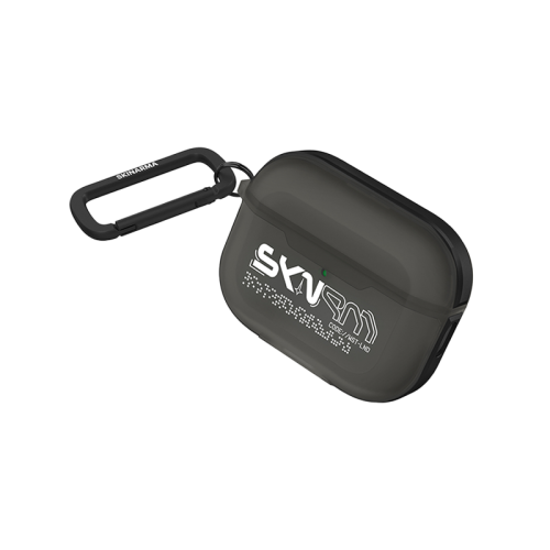 Protective designer case made for your AirPods Pro 3, featuring a semi-clear outer shield, metallic detailing, and a customised SKRM hook carabiner.